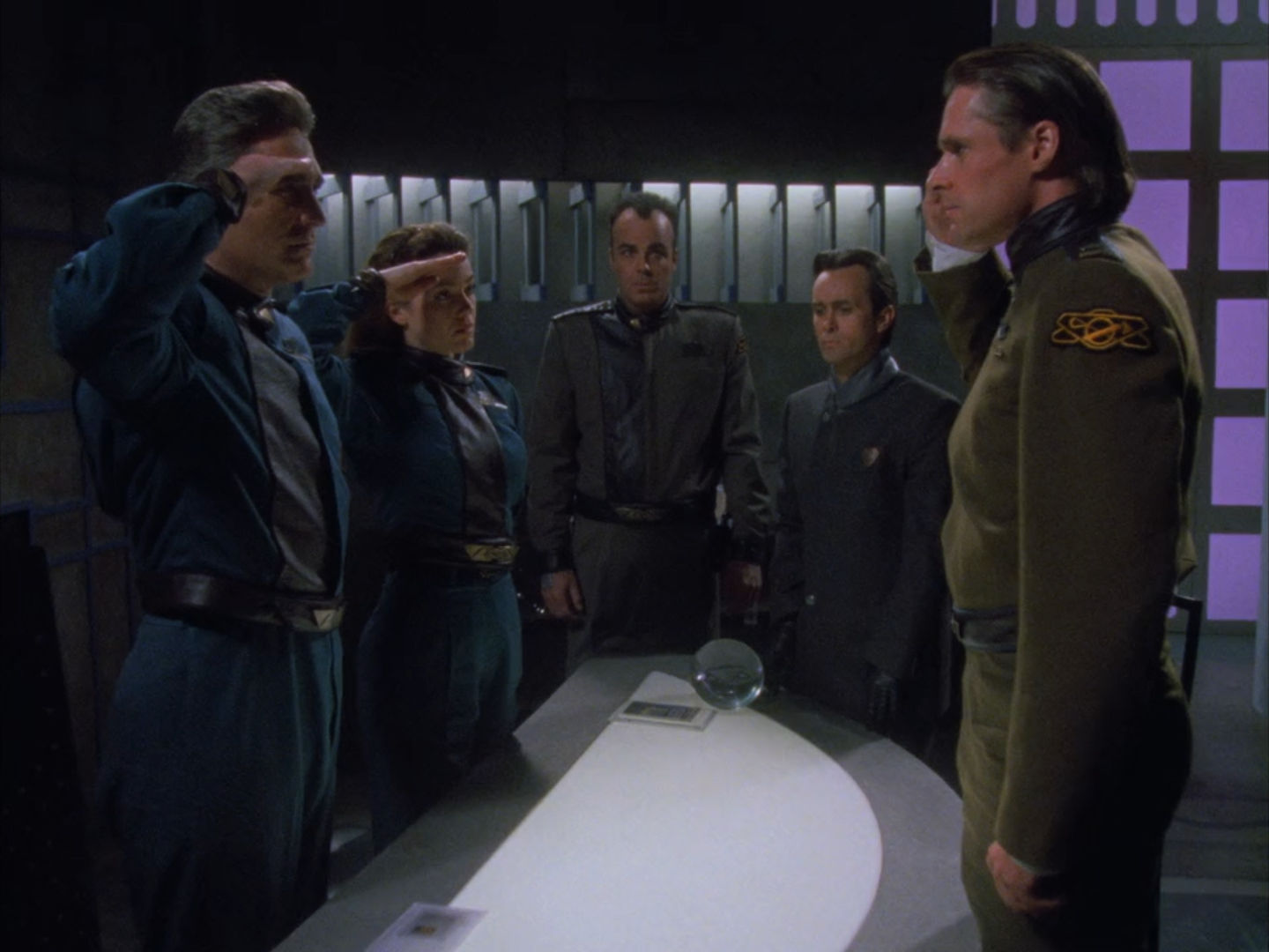 Later, the Colonel and Gray meet with Sinclair and his senior staff. Sinclair vouches for the loyalty of his people, but the Colonel is there on orders from the Joint Chiefs of Staff. Ivanova objects to the presence of Gray, citing regulations that prohibit the use of telepaths for such investigations. The Colonel explains that new regulations state that telepathic probes are enforceable and that all officers must submit. He also announces that Garibaldi is being reassigned to his staff for the duration of the investigation (over both Garibaldi and Sinclair's protests). Privately, Ivanova emphatically insists that she will not submit to a telepathic scan. Sinclair promises to prevent it from happening.