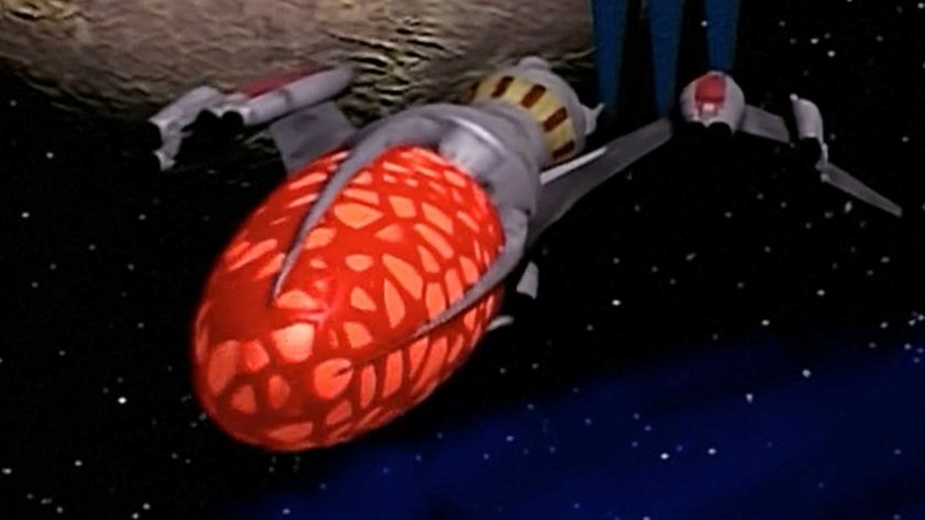 The original model that appeared in ("Deathwalker") featured a distinct red/orange aft section, though in all later appearances this was covered by a more conventional-looking grey casing.