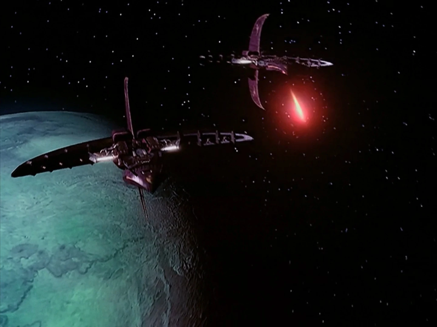 The warships' weaponry consists of 2 twin plasma accelerators, missiles for planetary bombardment[2] and guided mines[5]. The plasma accelerators have been known to destroy a Narn G'Quan class heavy cruiser in as little as 6 shots. [2] This type of weapon is used by Centauri forces mainly in a configuration which causes explosive damage to the target rather than slicing through its hull. [3] The missile launchers are located within the horizontally-positioned wing structures and are capable of firing missiles in rapid succession. Guided mines are stored within the forward beak-like section. In battle, they are released through a retractable hatch on the underside of the forward section.